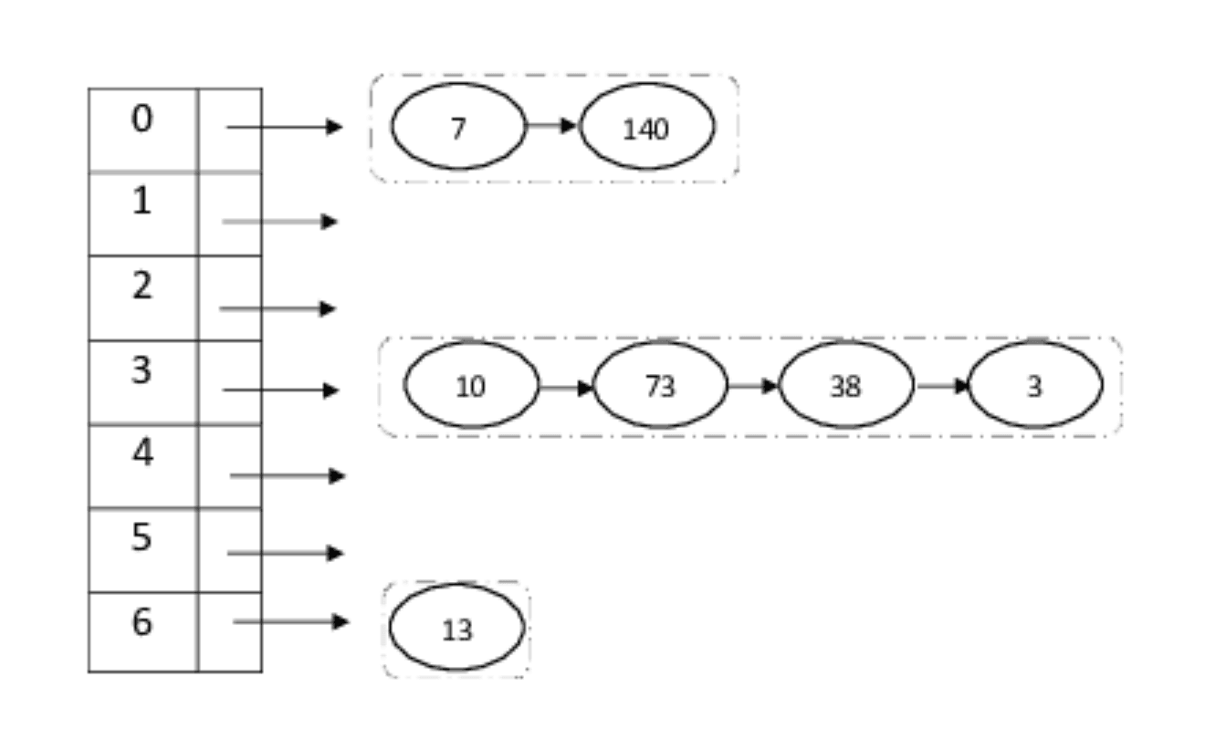 Note that it is not necessary that we employ a linked list for implementing the collision "chains". We could just as well use an AVL Tree, a Red-Black or B-Tree, or a SkipList!